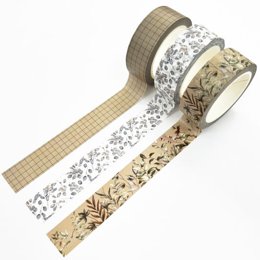 Foliage & Grid Washi Tape | Set Of Three | 15mm x 10m | Journalling Scrapbook Planner