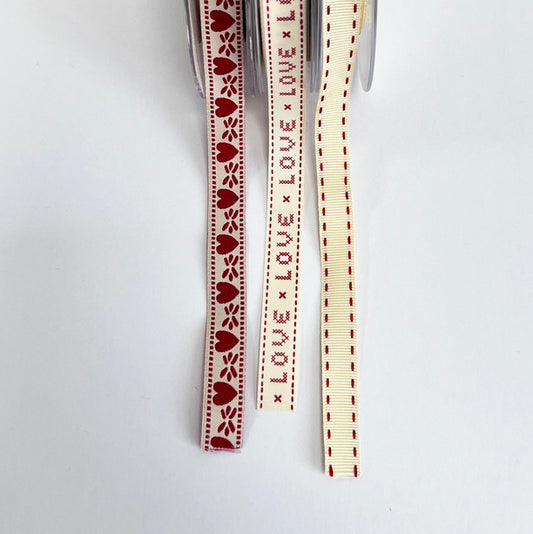 Red & Cream Love Ribbon | Gift Wrap | Hearts Love Stitch | 15mm Grosgrain Craft | Valentine's Craft