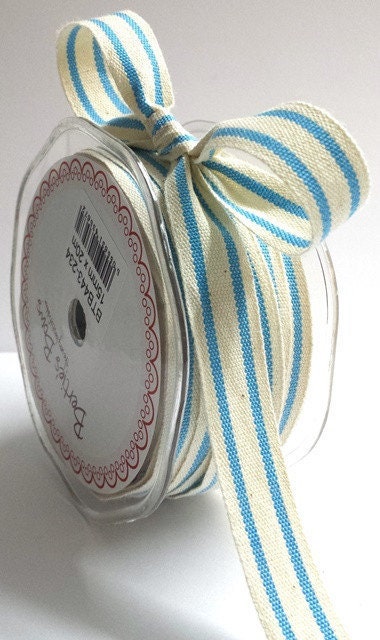 Sky Blue & Cream Ribbon | Stripe Cotton Rustic Ticking 16mm | 1m or 20m Roll