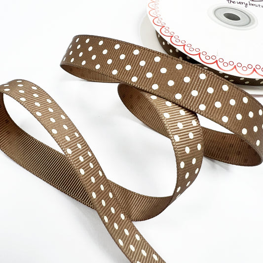 Spot Grosgrain Ribbon | Brown 16mm Polka Dot Spot | 1m 25m Roll