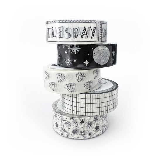Washi Tape Set Of 5 | Paper Tape Journal Planner Kit | Black & White | 5 x 1.5cm x 10m Rolls
