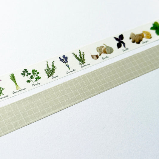 Washi Tape Garden Herbs & Neutral Grid | Journalling | 1.5cm x 10m