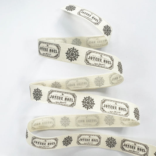 Christmas Ribbon 15mm Ivory Cotton Grey Joyeux Noel & Snowflake Print 1m 5m 25m