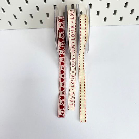 Red & Cream Love Ribbon | Gift Wrap | Hearts Love Stitch | 15mm Grosgrain Craft | Valentine's Craft
