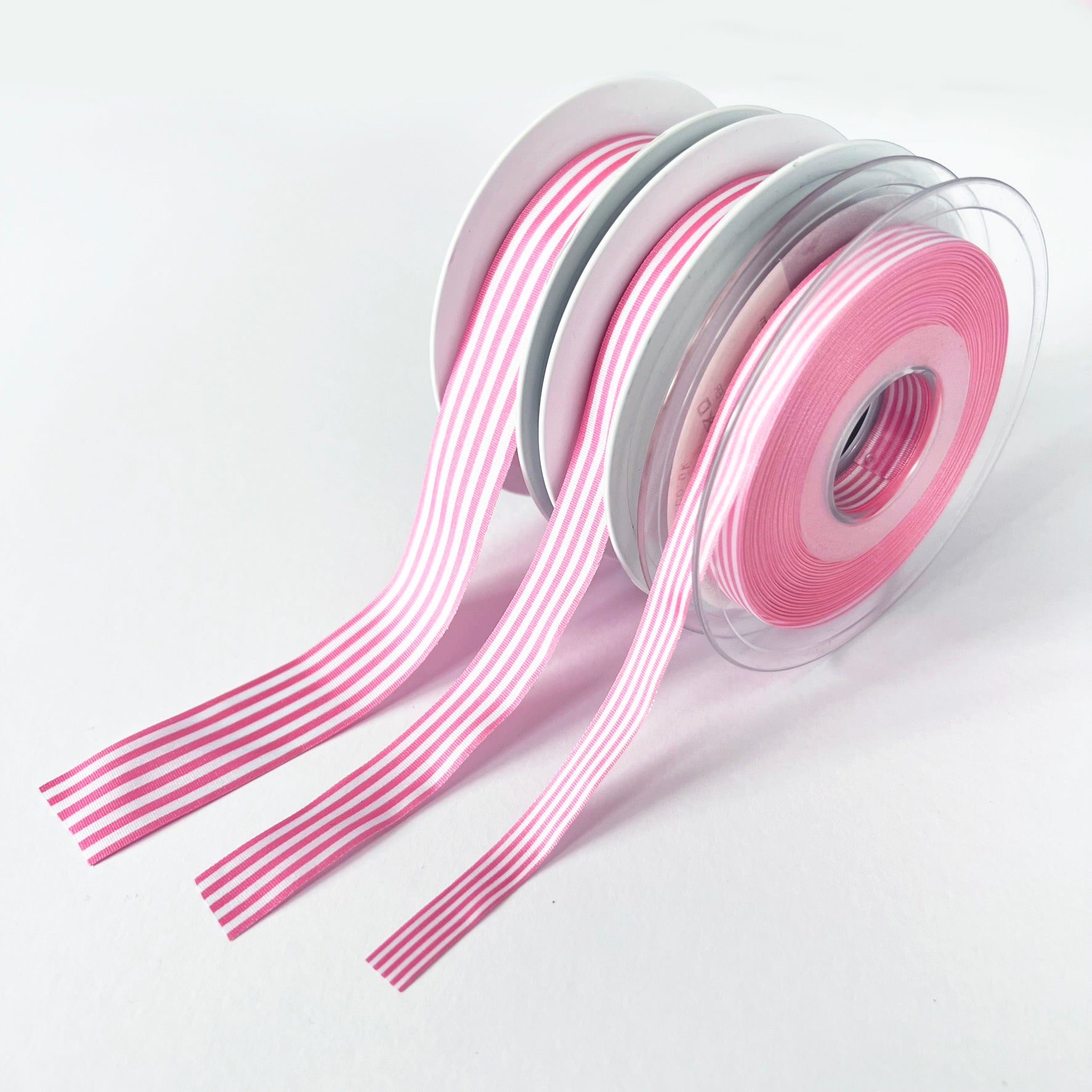 - Gorgeous pink & white nautical stripe woven lightweight polyester ribbon.