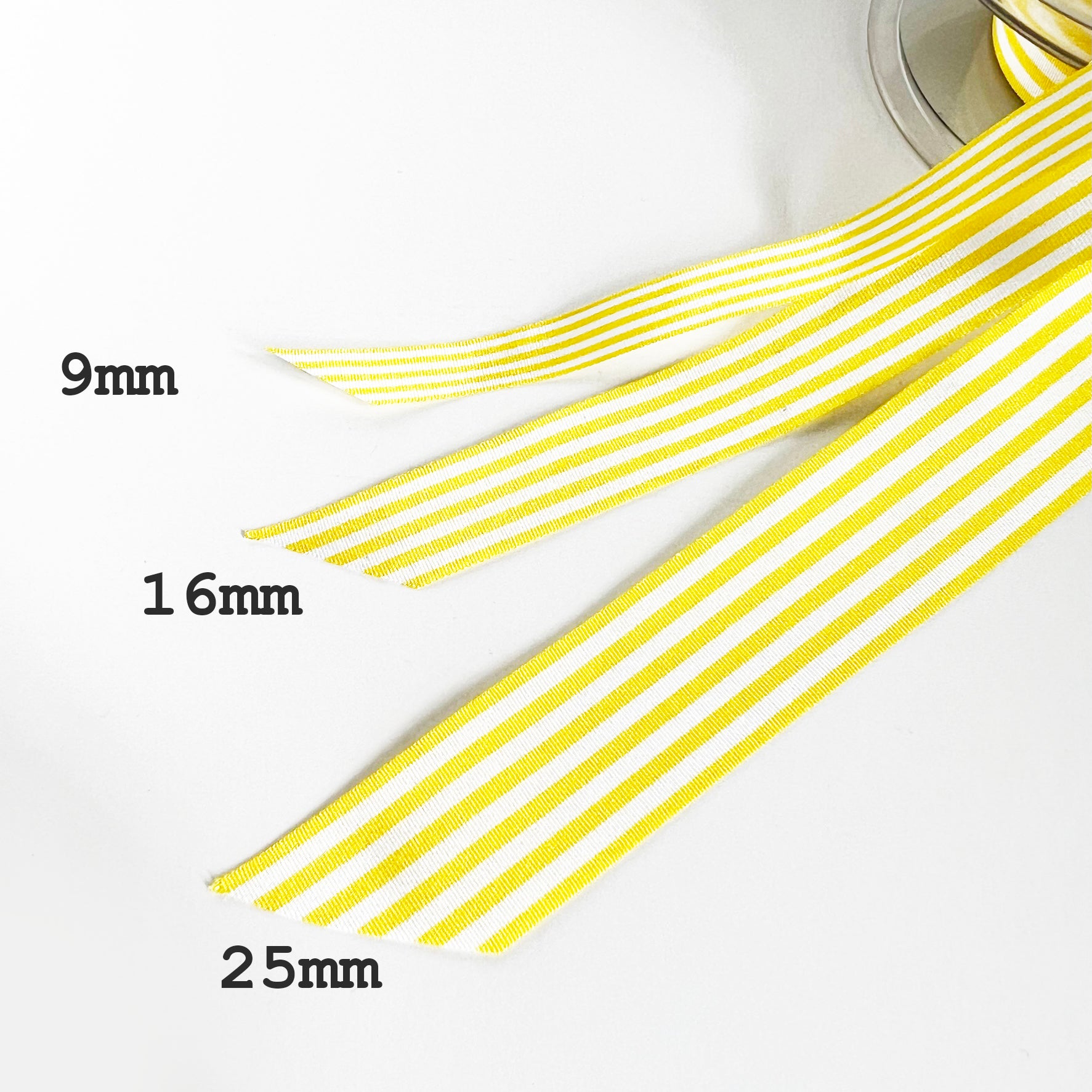Yellow Ribbon White Stripe | 3 Widths 9mm 16mm 25mm | 1m or Full Roll